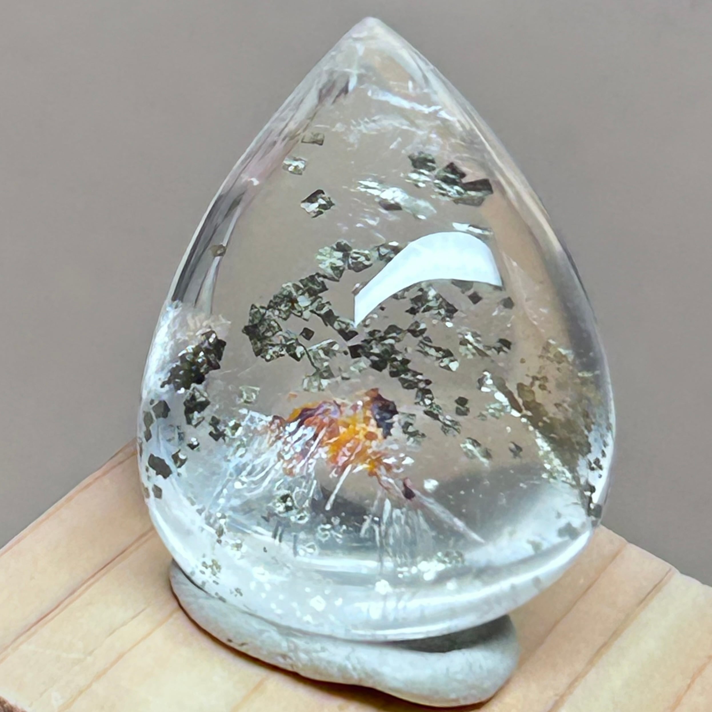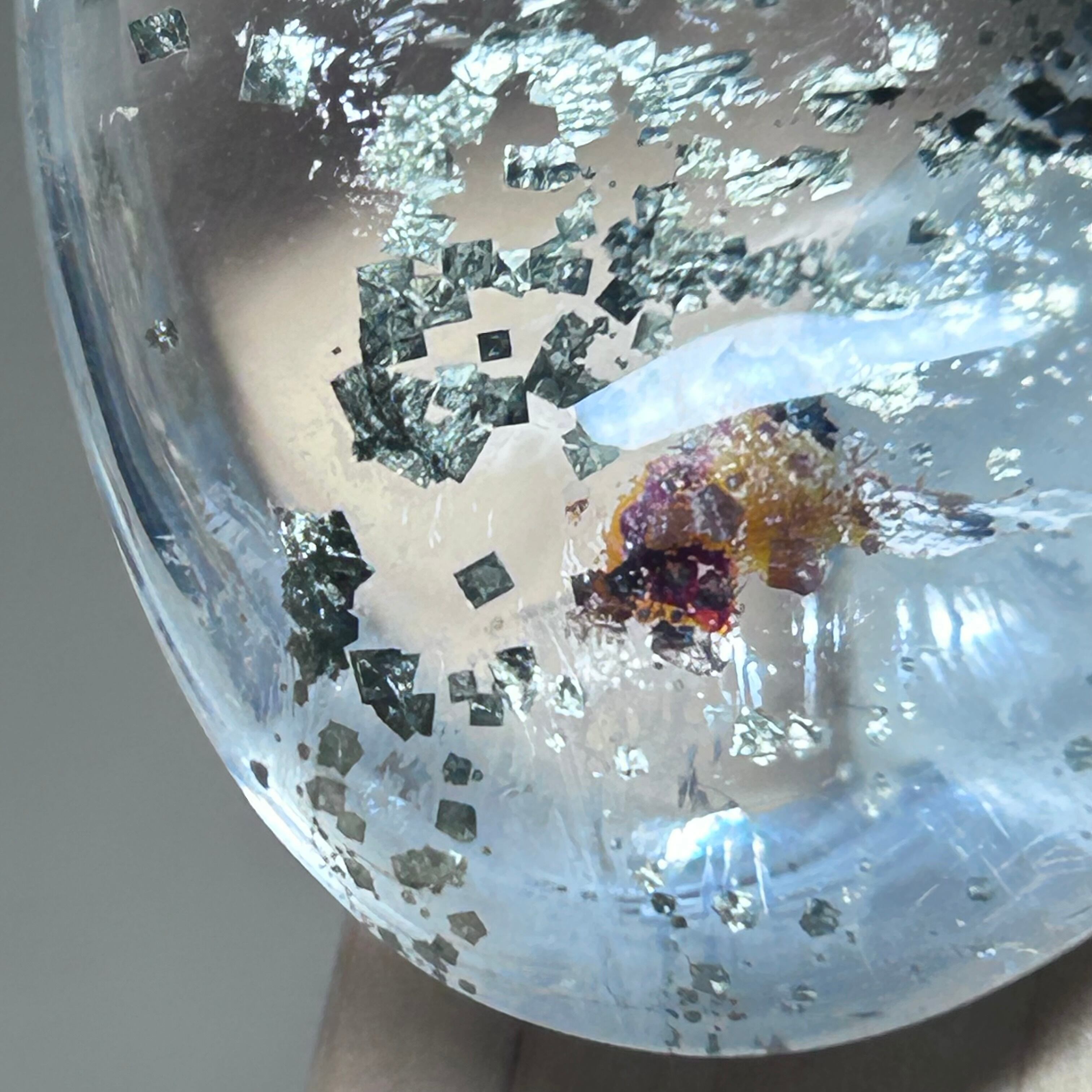 透明感のある水晶にキラキラパイライト結晶と赤茶色のリモナイトが内包されています